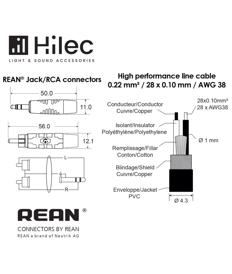 Cordon ligne 2x 4mm – 1x mini Jack 3,5 stéréo mâle / 2x RCA mâle – 1,5m connecteurs REAN
