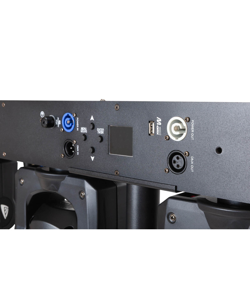 Barre lumineuse avec 4 lyres LEDs RGBW 40 W et contrôle DMX flexible. Programmes lumineux évolutifs, navigation par écran LCD et connecteurs XLR 3 points