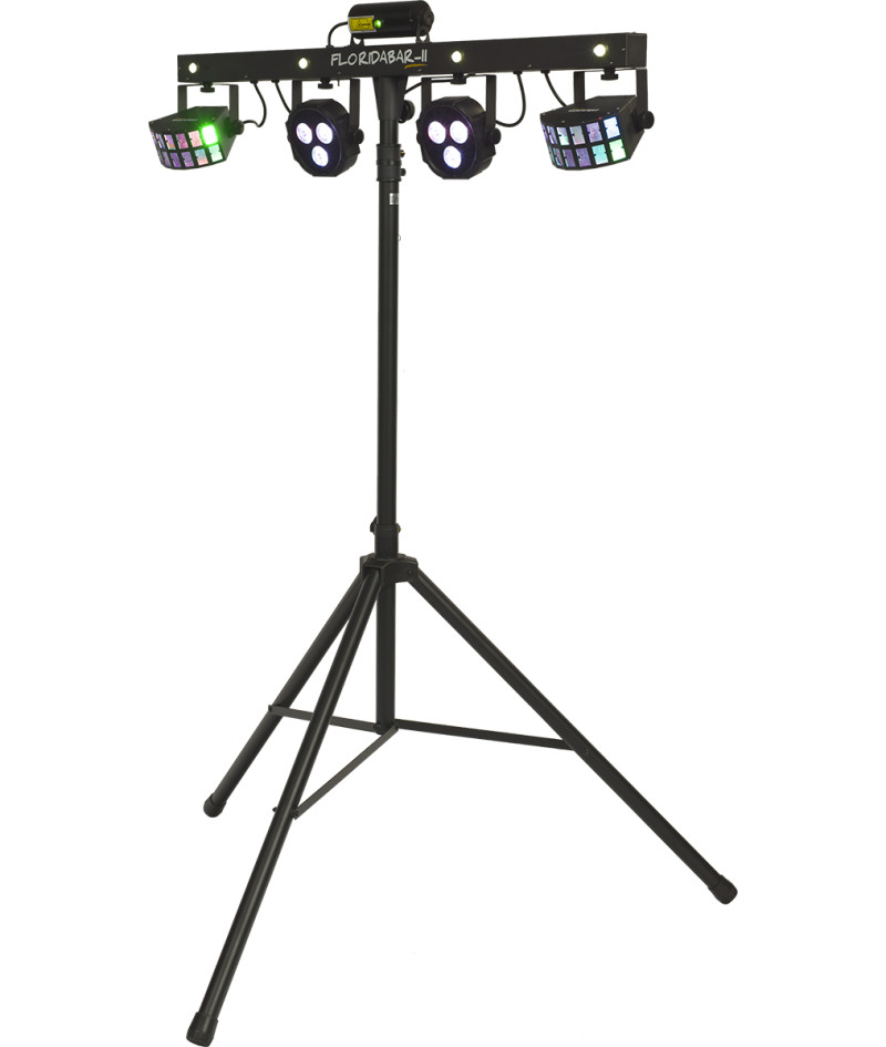 Le Florida Bar II est un système lumière 4-en-1 constituant une redoutable solution d'animation pour les DJ, les disco-mobiles, les groupes et les prestations privées. Composé de 2 PAR LED RGB et de 2 projecteurs d'effets Derby du plus bel effet, le Florida Bar II embarque également un Laser RG et un effet stroboscope assuré par 4 LED blanches pour des prestations percutantes. Ce système complet s'installe en quelques instants sur son robuste trépied télescopique, réduisant le temps d'installation au minimum nécessaire.