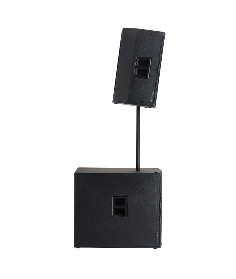 | Construction | 4 tampons caoutchouc dessous, Caisse renforcée en multiplis de 15mm, Forme asymétrique avec pans coupés pour position de retour, Grille métallique intégrale, LED Power/Clip en façade, Peinture Polyurea texturée anti-scratch |