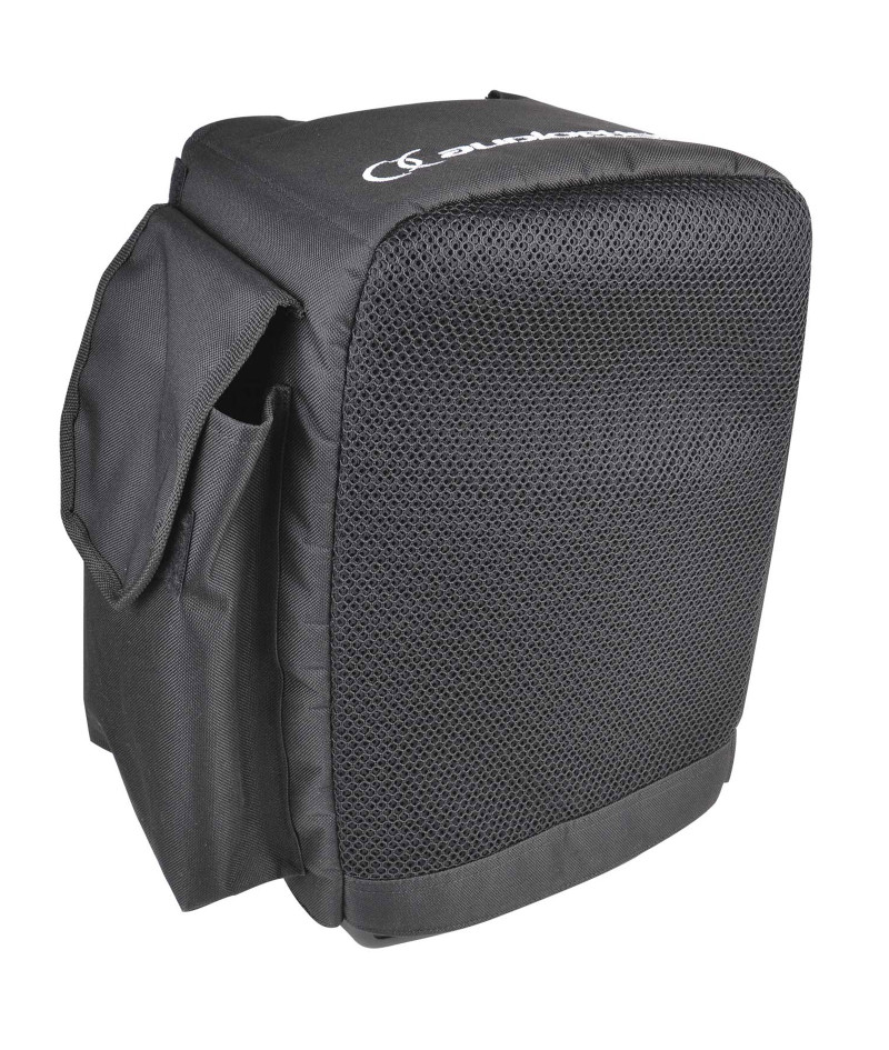 L’enceinte peut être utilisée avec sa housse grâce aux ouvertures à l’arrière et à la mousse acoustique en façade