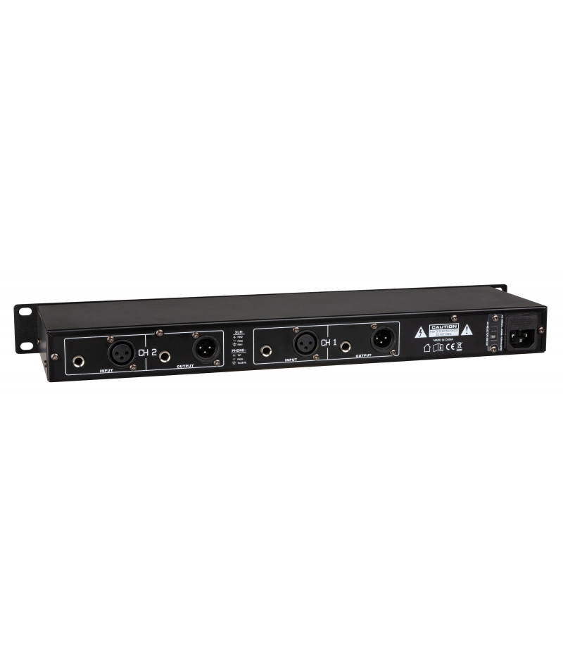Égaliseur graphique 2 x 15 bandes avec plage d’ajustement de +/-12 dB et connectiques XLR 3 points et jack 6,35 mm Indicateurs de niveau de sortie à 4 segments et filtre passe-haut 50 Hz